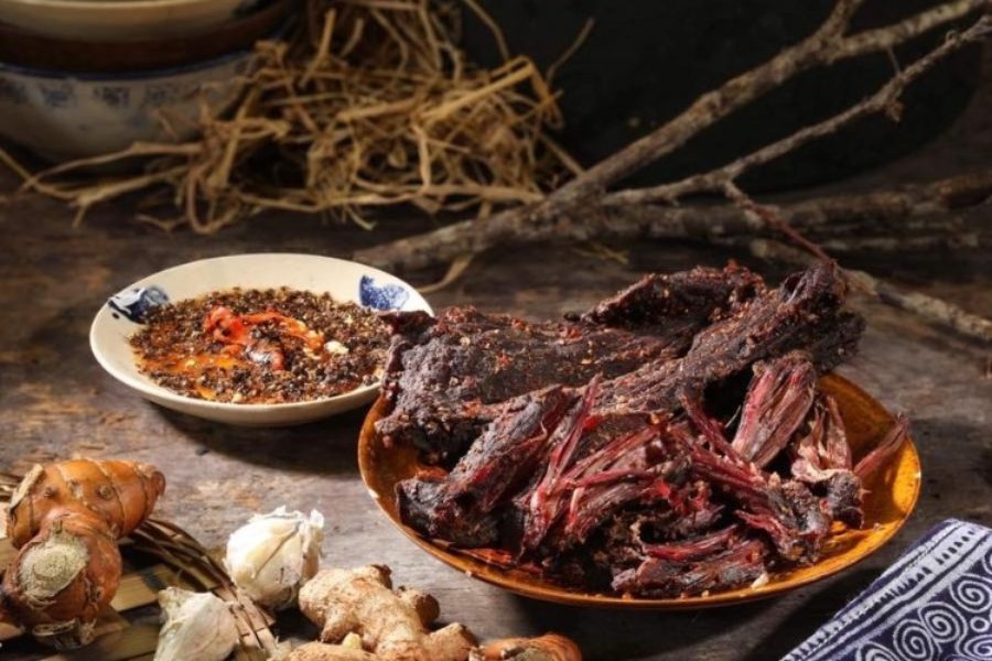 Thịt trâu được ướp mắc khén, gừng và muối, rồi hun bằng khói củi rừng, giúp bảo quản đến 6 tháng mà vẫn mềm ngọt.