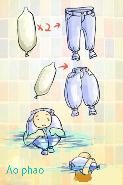 Dùng những chiếc quần hoặc áo cho bao cao su đã thổi căng vào tạo thành một chiếc phao cứu sinh tạm thời