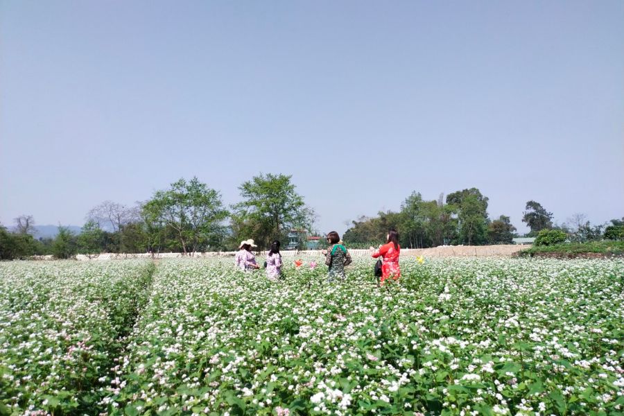 Hoa tam giác mạch nở trên 500ha cao nguyên là biểu tượng sống ảo Cao Bằng, lượng tìm kiếm hoa tam giác mạch cao bằng cao nhất mùa (6.000/tháng). Chị Ngọc từ Nha Trang kể: "Nằm giữa cánh đồng Phia Oắc tháng 11/2024, drone shot toàn cảnh – post lên IG Reels viral với 15.000 like."
